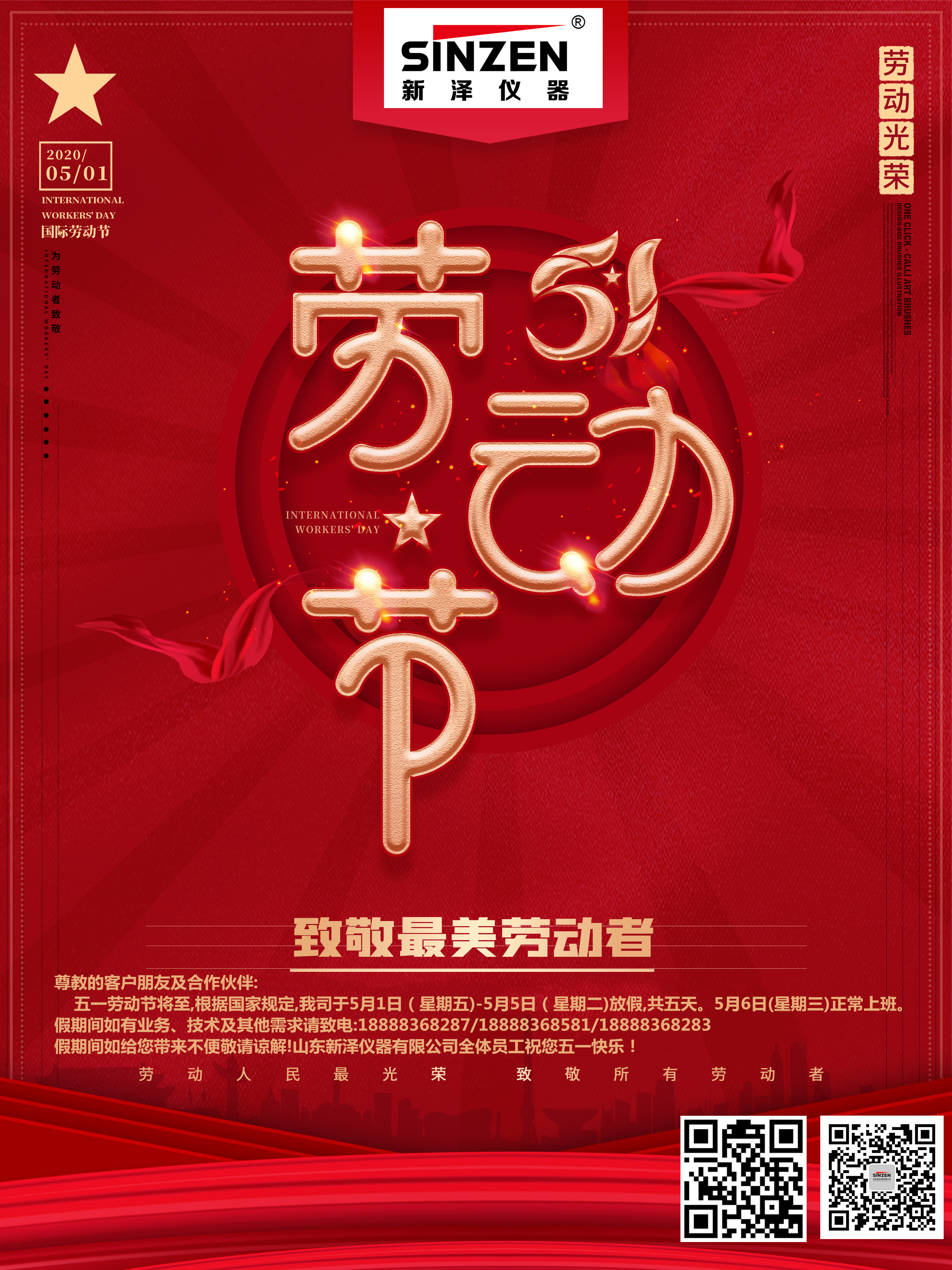 五一勞動節降至,根據國家規定:我司于05月01日(星期五)至05月05日(星期二)放假,共5天。05月06日(星期三)正常上班。假期期間如有業務、技術及其其他需求請致電: