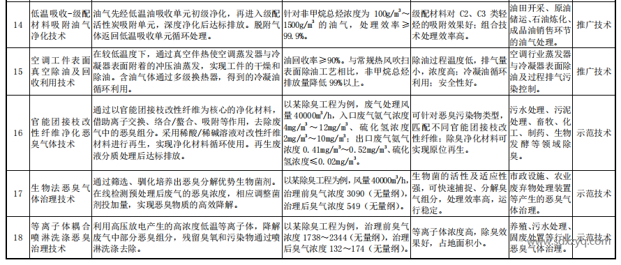 在這些技術中,有幾項特別引人注目。例如,低溫吸收-級配材料吸附油氣凈化技術、空調工件表面真空除油及回收利用技術被歸類為推廣技術,這意味著這些技術已經具備了廣泛的應用基礎和良好的市場前景。而冷凝-吸附-催化油氣回收凈化技術、官能團接枝改性纖維凈化惡臭氣體技術、生物法惡臭氣體治理技術和等離子體耦合噴淋洗滌惡臭治理技術被列為示范技術,顯示了這些技術在創新性和應用潛力上的優勢。