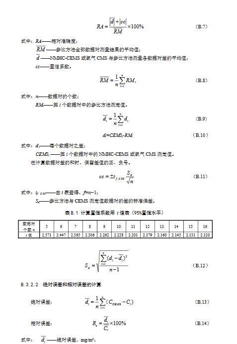 3.10相對(duì)準(zhǔn)確度Relativeaccuracy采用參比方法與NMHC-CEMS同步測(cè)定廢氣中氣態(tài)污染物濃度,取同時(shí)間區(qū)間且相同狀態(tài)測(cè)量結(jié)果組成若干數(shù)據(jù)對(duì),數(shù)據(jù)對(duì)之差平均值的絕對(duì)值與置信系數(shù)之和與參比方法測(cè)定數(shù)據(jù)的平均值之比。