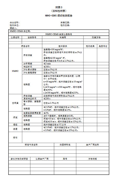 9.3.3驗(yàn)收?qǐng)?bào)告技術(shù)指標(biāo)驗(yàn)收測(cè)試報(bào)告應(yīng)包括以下信息:a)報(bào)告標(biāo)識(shí)-編號(hào);b)檢測(cè)日期和編制報(bào)告日期;c)NMHC-CEMS標(biāo)識(shí)-制造單位、型號(hào)和系列編號(hào);d)包括在系統(tǒng)中的NMHC-CEMS的主要組件(如氣體檢測(cè)器、流速CMS等);e)安裝NMHC-CEMS的企業(yè)名稱(chēng)和安裝位置相關(guān)污染源名稱(chēng);f)環(huán)境條件記錄情況(大氣壓力、環(huán)境溫度、環(huán)境濕度);g)示值誤差、分析周期、系統(tǒng)響應(yīng)時(shí)間、零點(diǎn)漂移和量程漂移驗(yàn)收引用的標(biāo)準(zhǔn)及技術(shù)指標(biāo)要求;h)準(zhǔn)確度驗(yàn)收引用的標(biāo)準(zhǔn)及技術(shù)指標(biāo)要求;i)可溯源到國(guó)家標(biāo)準(zhǔn)的標(biāo)準(zhǔn)氣體;j)參比方法所用的主要設(shè)備、儀器等;k)檢測(cè)結(jié)果和結(jié)論;l)測(cè)試單位;m)三級(jí)審核簽字;n)色譜分析儀出廠檢測(cè)原始譜圖復(fù)印件;o)驗(yàn)收測(cè)試結(jié)果和驗(yàn)收測(cè)試報(bào)告,格式參照HJ75附錄F;7p)備注(技術(shù)驗(yàn)收單位認(rèn)為與評(píng)估NMHC-CEMS性能相關(guān)的其他信息)。技術(shù)指標(biāo)驗(yàn)收完成后編制技術(shù)指標(biāo)驗(yàn)收?qǐng)?bào)告,技術(shù)指標(biāo)驗(yàn)收結(jié)果應(yīng)達(dá)到本標(biāo)準(zhǔn)表1的要求。
