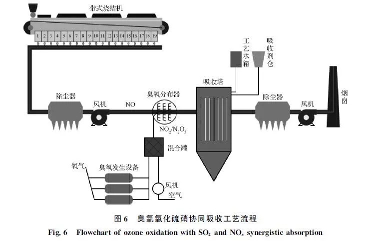 臭氧氧化硫硝協同吸收技術系統簡單,占地面積小,該技術適用于煙氣溫度較低的燒結機,在實現排放指標的同時,可減少投資和運行費用。通過臭氧的氧化作用,不易被吸收劑吸收的NO在煙道中被氧化為高價態NOx,可與SO2一起在后續脫硫塔中同時被吸收,不需再配置獨立的脫硝裝置,同時不存在SO3無法脫除的問題。