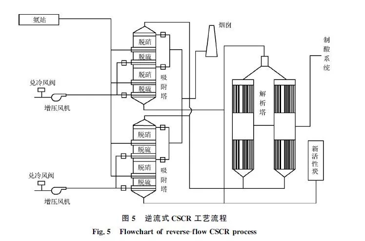 河鋼邯鋼在國內率先選用了逆流式活性炭選擇性催化還原(CSCR)凈化燒結煙氣工藝,工藝流程如圖5所示。SO2通過活性炭的吸附-解析,再經過催化氧化制成濃硫酸,實現了資源回收利用。通過脫硫段后,在上升的煙氣中進行噴氨,進入脫硝段后在活性炭的催化作用下NOx轉化為N2和水進行脫硝。2018年2月邯鋼西區燒結機投運了逆流式CSCR工藝,實現長周期穩定運行和較高的煙氣凈化效率,2018年上半年原始煙氣顆粒物質量濃度為50~130mg/m3,SO2質量濃度為750~900mg/m3,NOx質量濃度為300~400mg/m3,凈化后煙囪NOx排放質量濃度低于50mg/m3,SO2排放質量濃度低于10mg/m3,固體顆粒物排放質量濃度低于15mg/m3。