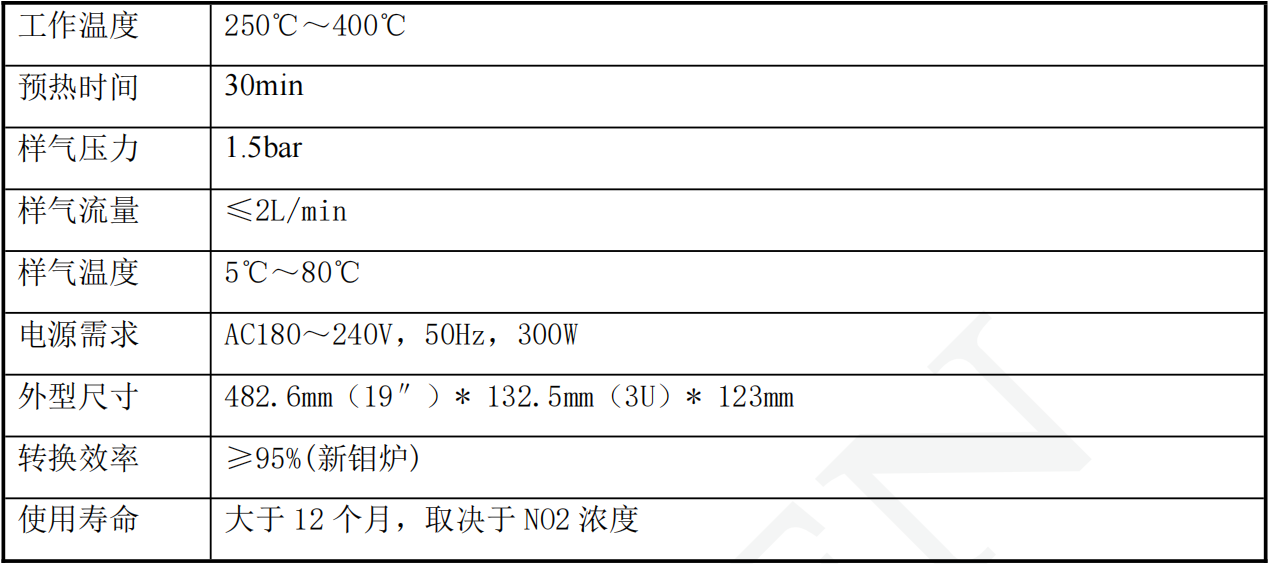 氮氧化物轉換器具有低溫下的高轉換率、使用壽命長、可靠性好、安裝方便等特點。該轉換器采用了公司的專利技術,可有效的使煙氣在轉換管中與填充料充分反應,使NO2的轉化效率達到95%以上。在正常操作環境下,轉換管內的填充材料使用壽命達12個月之久,這樣使得維護費用降低到最低。可廣泛應用于環保在線監測以及汽車尾氣檢測。