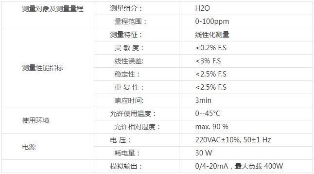 基本原理:傳感器采用五氧化二磷電解法原理,此傳感器由一個玻璃材質的圓柱和兩根并行的電極(通常由鉑或銠金屬絲制成)組成,并在兩根電極之間涂有很薄的一層磷酸膜層。在兩電極間施加一直流電壓,氣體中的水分被作為吸濕劑的五氧化二磷膜層連續吸收,生成磷酸,并被電解為氫和氧,同時五氧化二磷得以再生。通過連續的電解過程,在樣氣的水分含量與電解后的水分之間建立平衡,電解電流與樣氣中水分含量成比例。